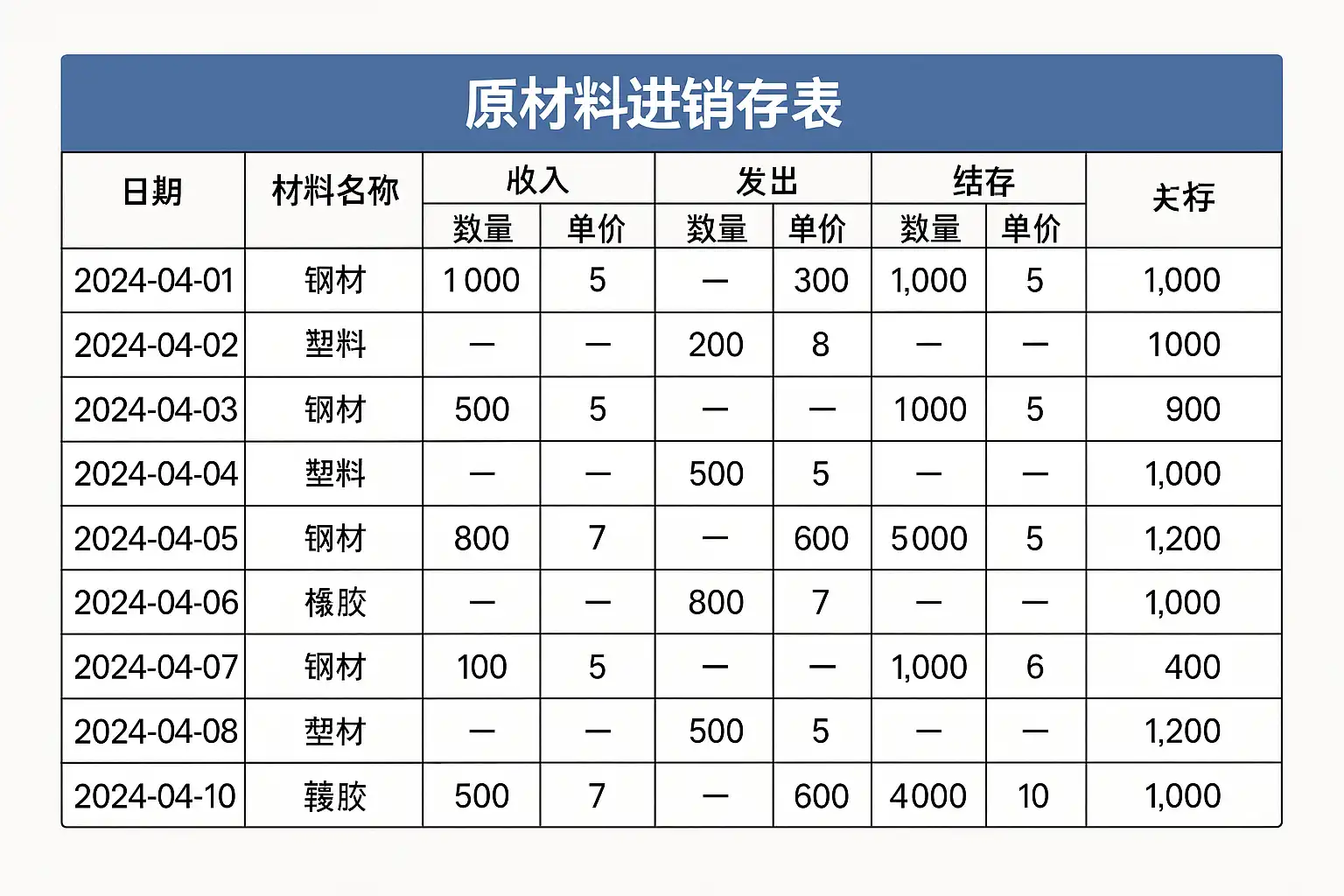 - 明细台账:逐笔记录每次进出及调整。