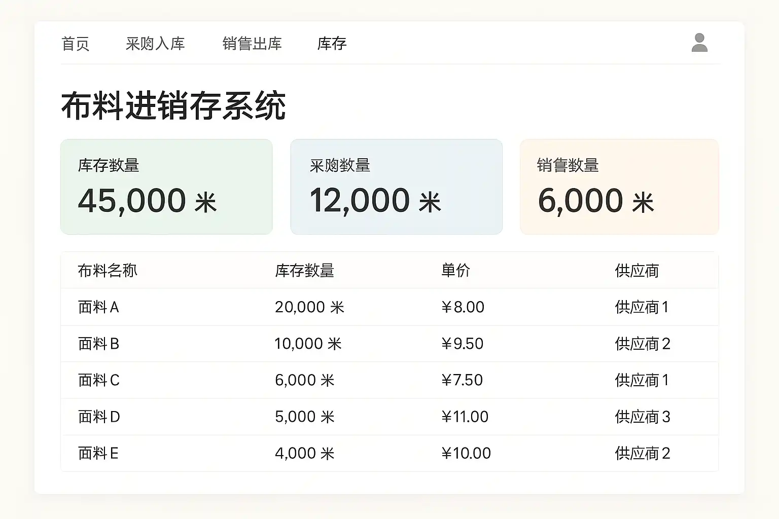 | 排名 | 品名 | 总销量(米) ||---------|-----------------|--------------|| 1 | 全棉斜纹 | 8000 || 2 | 涤棉混纺 | 6500 |通过定期分析这些数据,可以及时调整采购计划和促销策略,有效减少资金占压和呆滞积压风险。