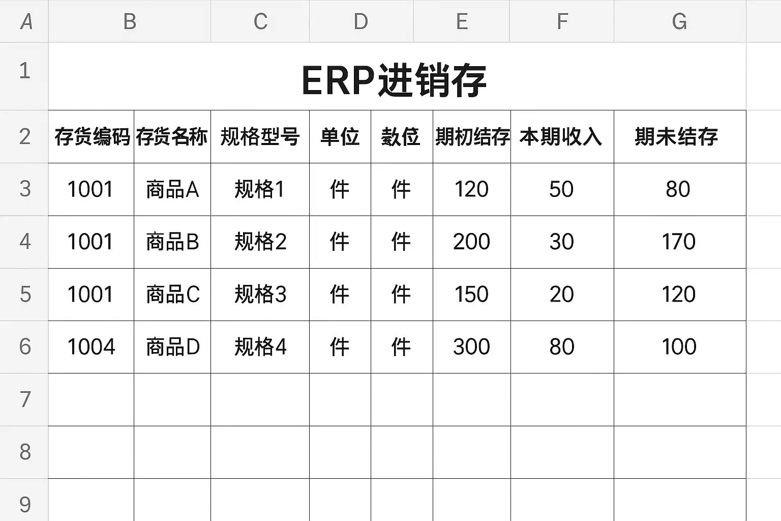 如何设计Excel表格结构来高效管理ERP中的采购、销售和库存?