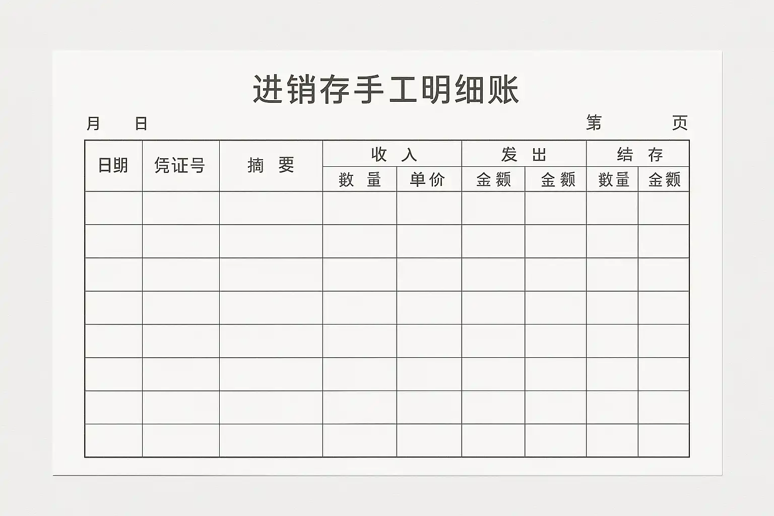 手工明细账是企业日常库存管理的重要工具,其主要目的是详尽记录商品在入库、出库与结存过程中的各项信息。一个标准的进销存手工明细账通常包括以下栏目: