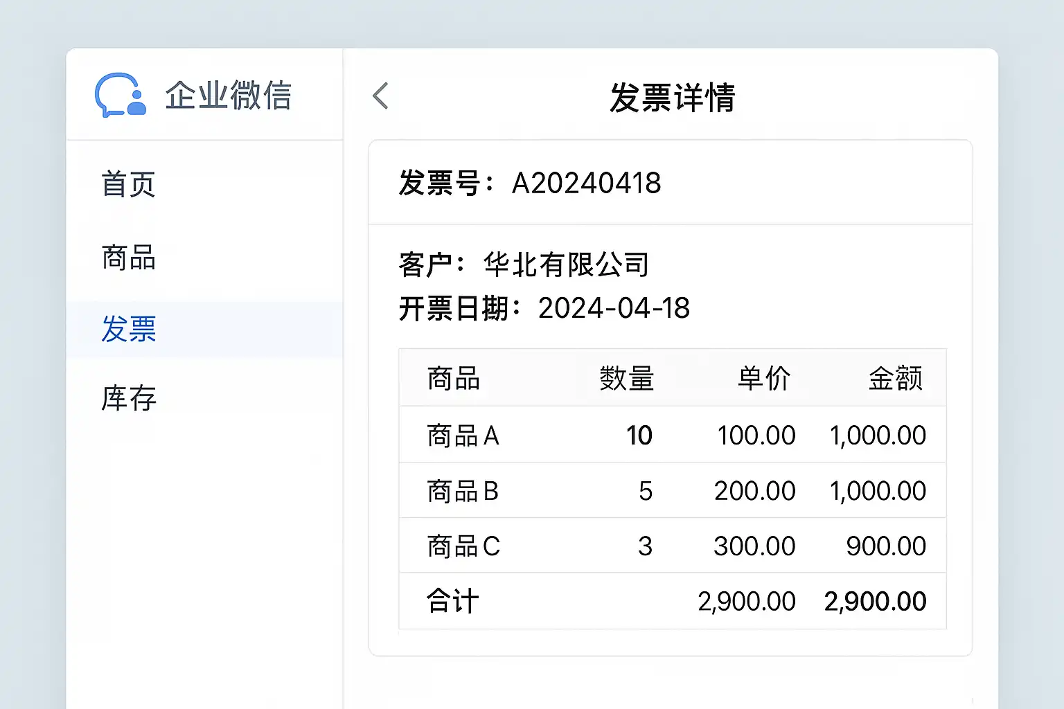 在企业微信进销存中查看发票,首先登录企业微信后台,进入“进销存”模块;然后点击左侧菜单中的“发票管理”;在这里可以看到所有已开具和待处理的发票列表。通过筛选条件(如日期、客户名称、发票状态)快速定位目标发票,提高查找效率。