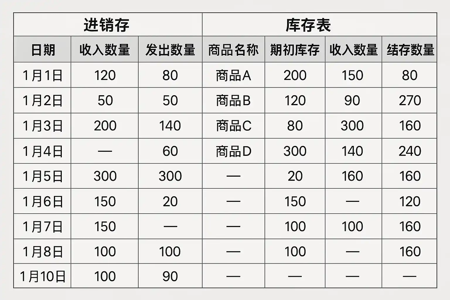 制作进销存和库存表格,首先要明确核心数据字段,包括商品名称、规格、单价、数量、进货时间、销售时间及库存余额。常用步骤如下: