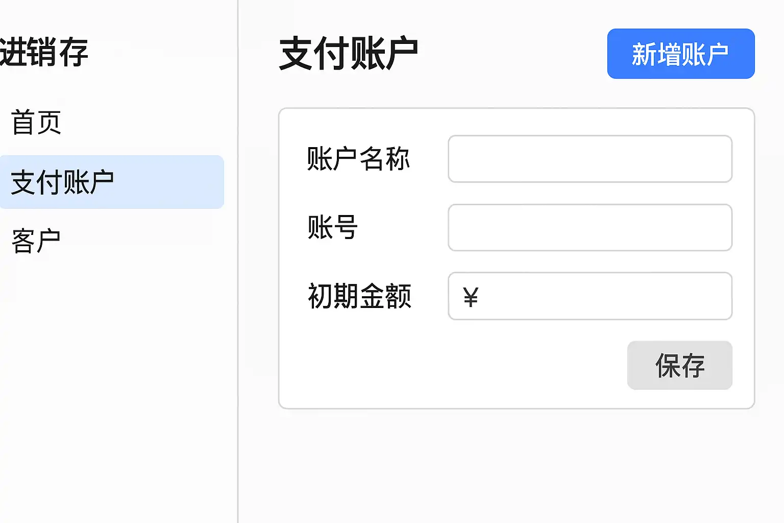 在进销存系统中新增支付账户,一般需要进入“设置”或“账户管理”模块,选择“新增支付账户”,填写账户名称、银行信息及账户类型等关键字段。以某品牌ERP为例,填写完成后点击保存即可完成新增。此过程通常包括以下步骤: