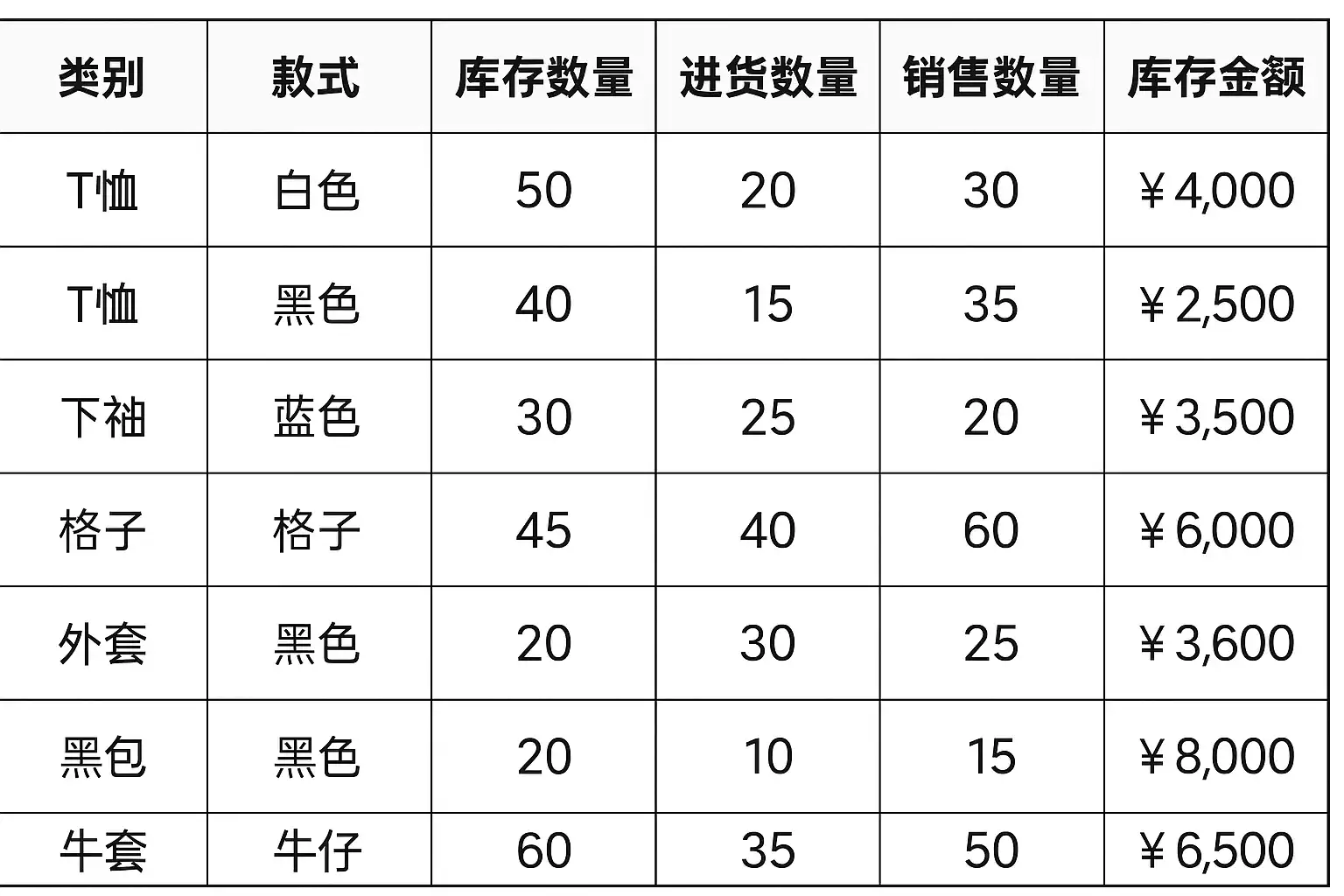 - 分类明确(按款式/颜色/尺码)方便录入与查询;