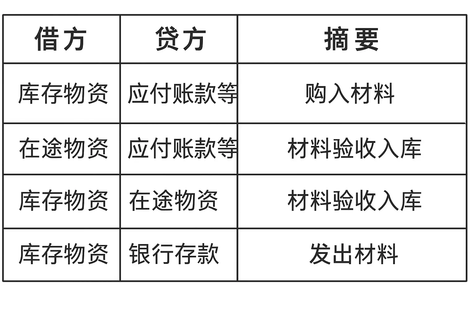 | 2. 收货入库 | 药品/物资到货验收 | 库存商品/材料采购 | 应付账款/现金 |