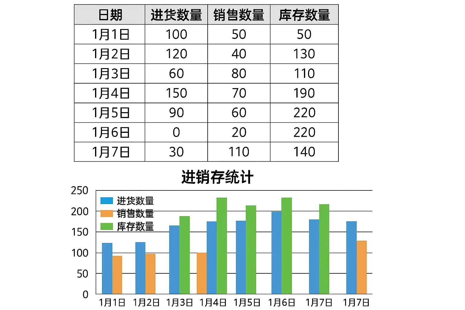 | 入库与出库对比 | 柱状堆叠/并列柱形图 | 月度采购与发货情况横向比较 |
