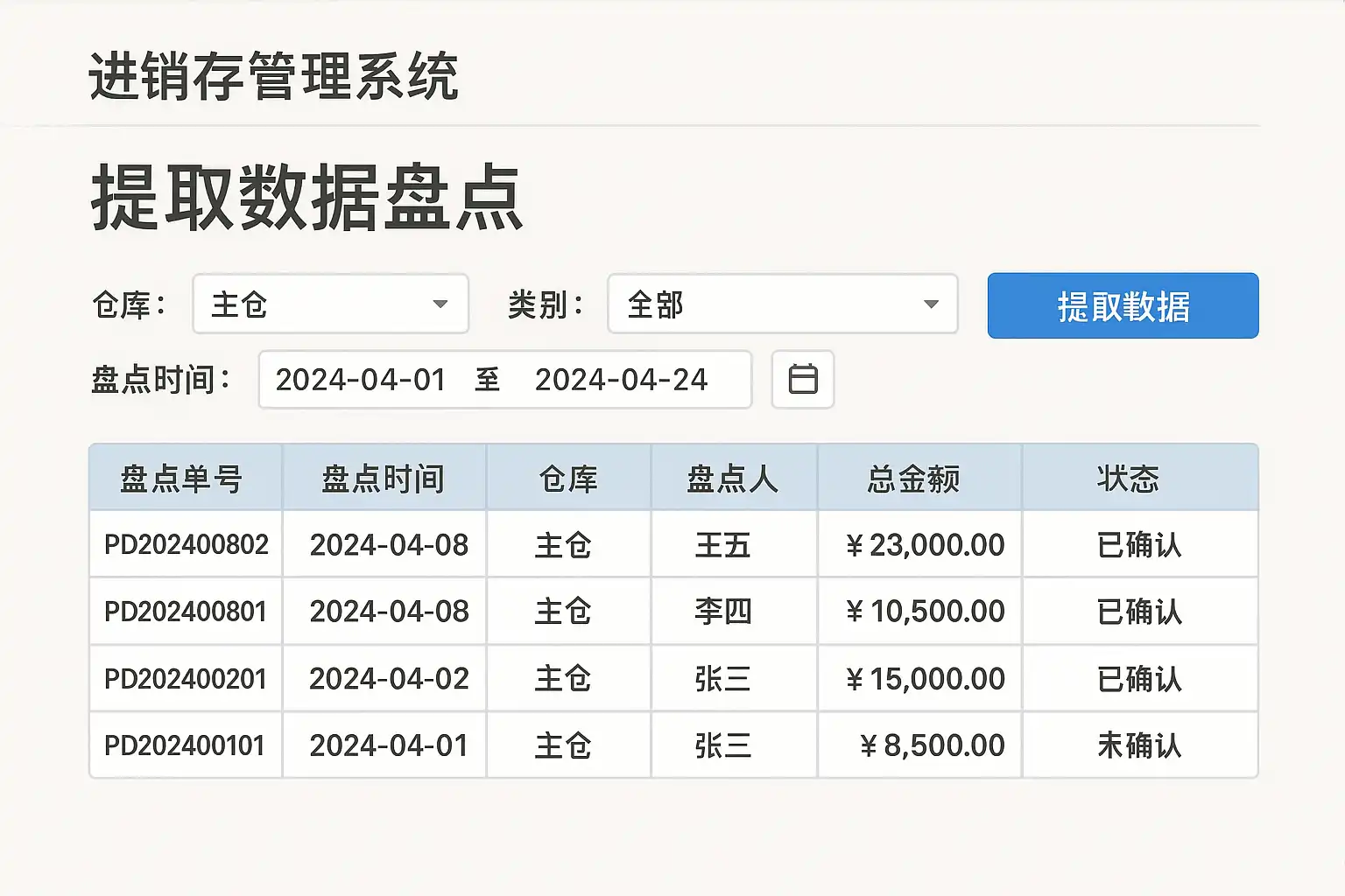 我刚开始使用进销存管理系统,但不太清楚如何从系统中提取数据进行盘点。能详细说明一下具体步骤和注意事项吗?