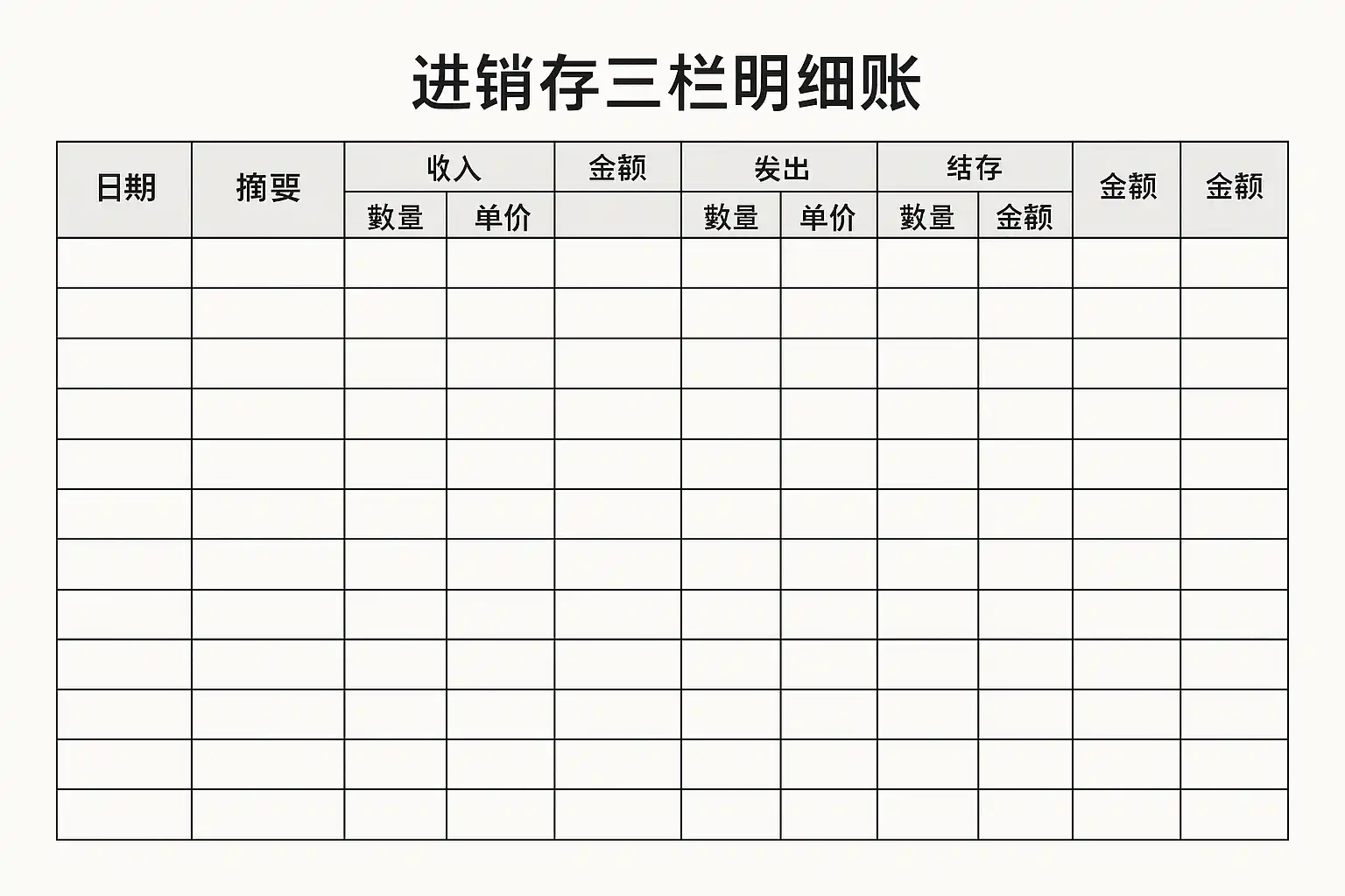 进销存三栏明细账是一种常用于商品流通企业及零售行业的会计辅助账簿,其核心作用是记录每一种商品在一定期间内的“收入(进货)”、“发出(销售/领用)”以及“结存(库存剩余)”三个方面的数据,包括数量和金额两项内容。该明细账能为企业提供全面、动态的库存及成本管理依据。