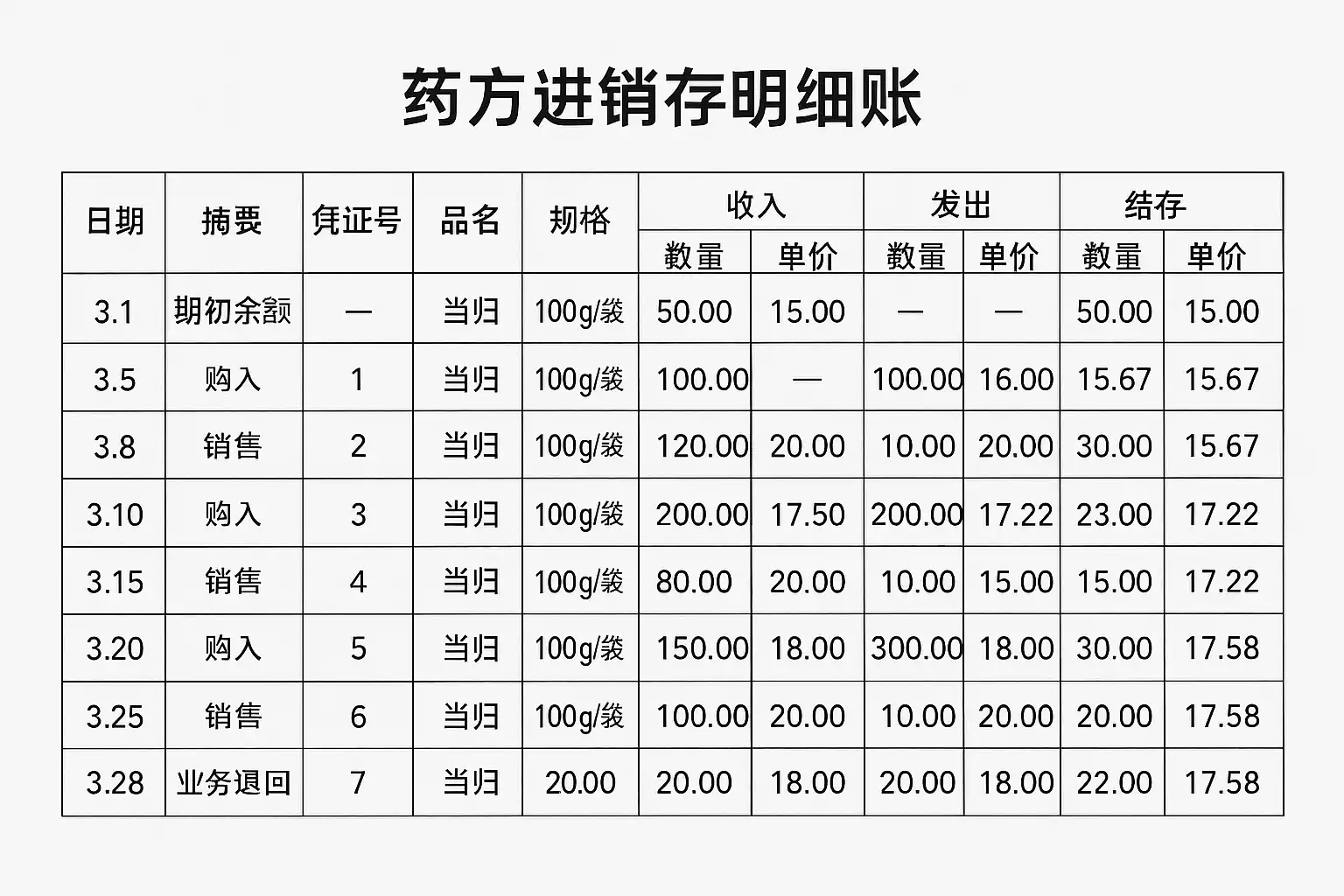 药方进销存明细账要求对每一项交易进行详细登记,确保数据真实完整。具体包括以下内容: