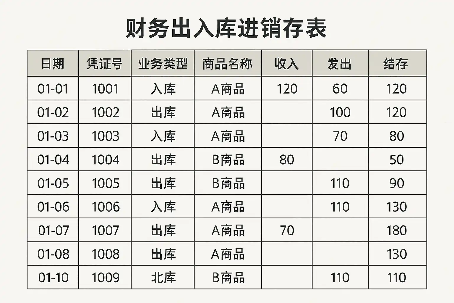 一个科学合理的进销存表格,必须覆盖企业日常经营中涉及到的所有关键环节,包括采购(进货)、销售(出库)以及当前库存状态。以下是标准化财务出入库进销存表各部分及其核心字段: