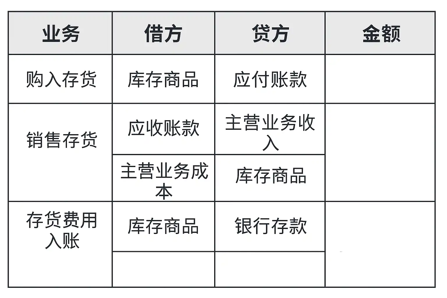 | 业务类型 | 会计科目 | 借方金额 | 贷方金额 | 分录说明 || -------- | ---------------- | -------- | -------- | ------------------ || 采购入库 | 库存商品 | ¥10,000 | | 增加库存 || | 应付账款 | | ¥10,000 | 确认应付款项 || 销售出库 | 应收账款 | ¥15,000 | | 确认销售收入 || | 主营业务收入 | | ¥15,000 | 收入确认 || 销售出库成本转出 | 主营业务成本 | ¥7,000 | | 成本费用确认 || | 库存商品 | | ¥7,000 | 减少库存 |