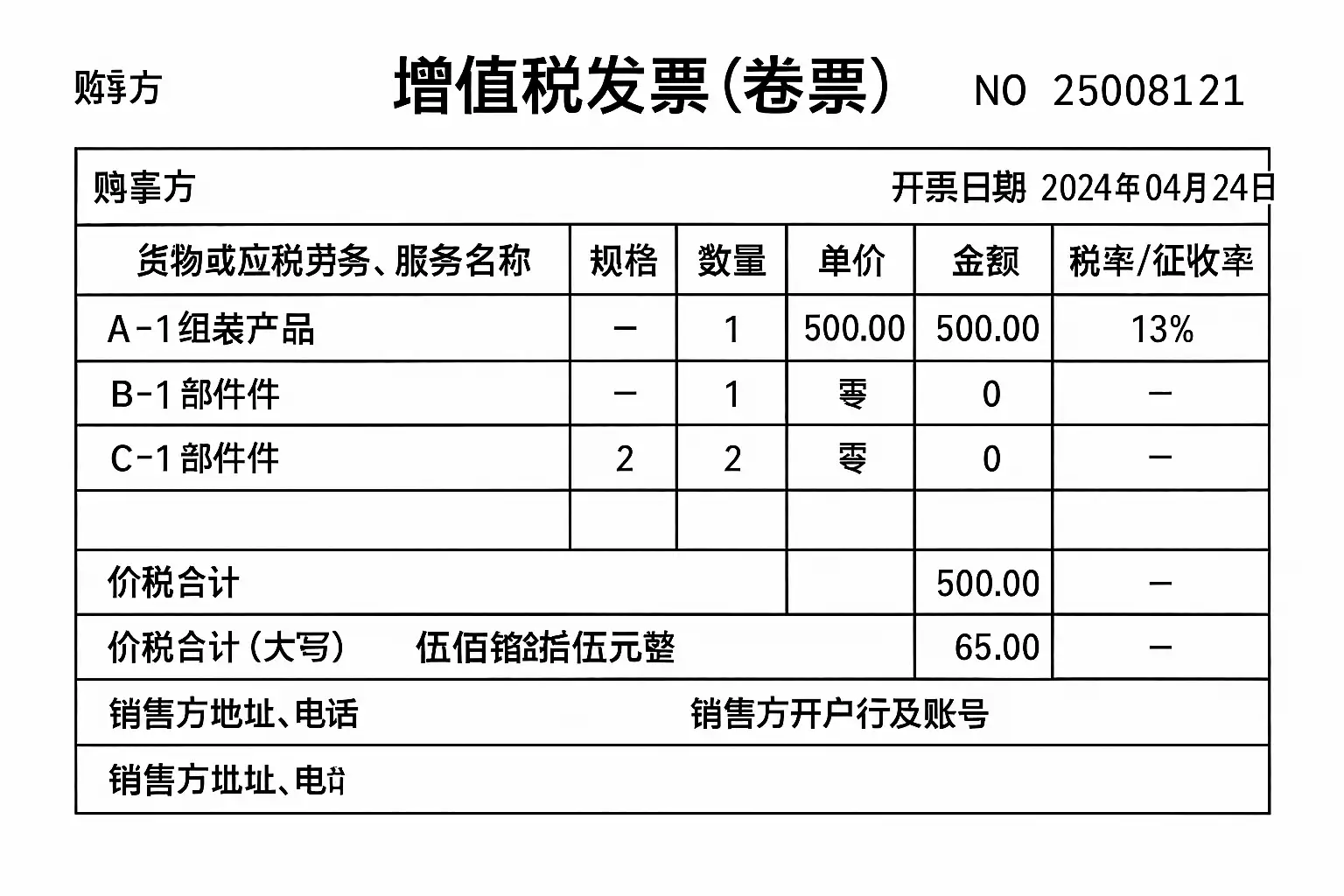 - 发票内容需清晰列明‘组装费’、‘原材料费’等项目。