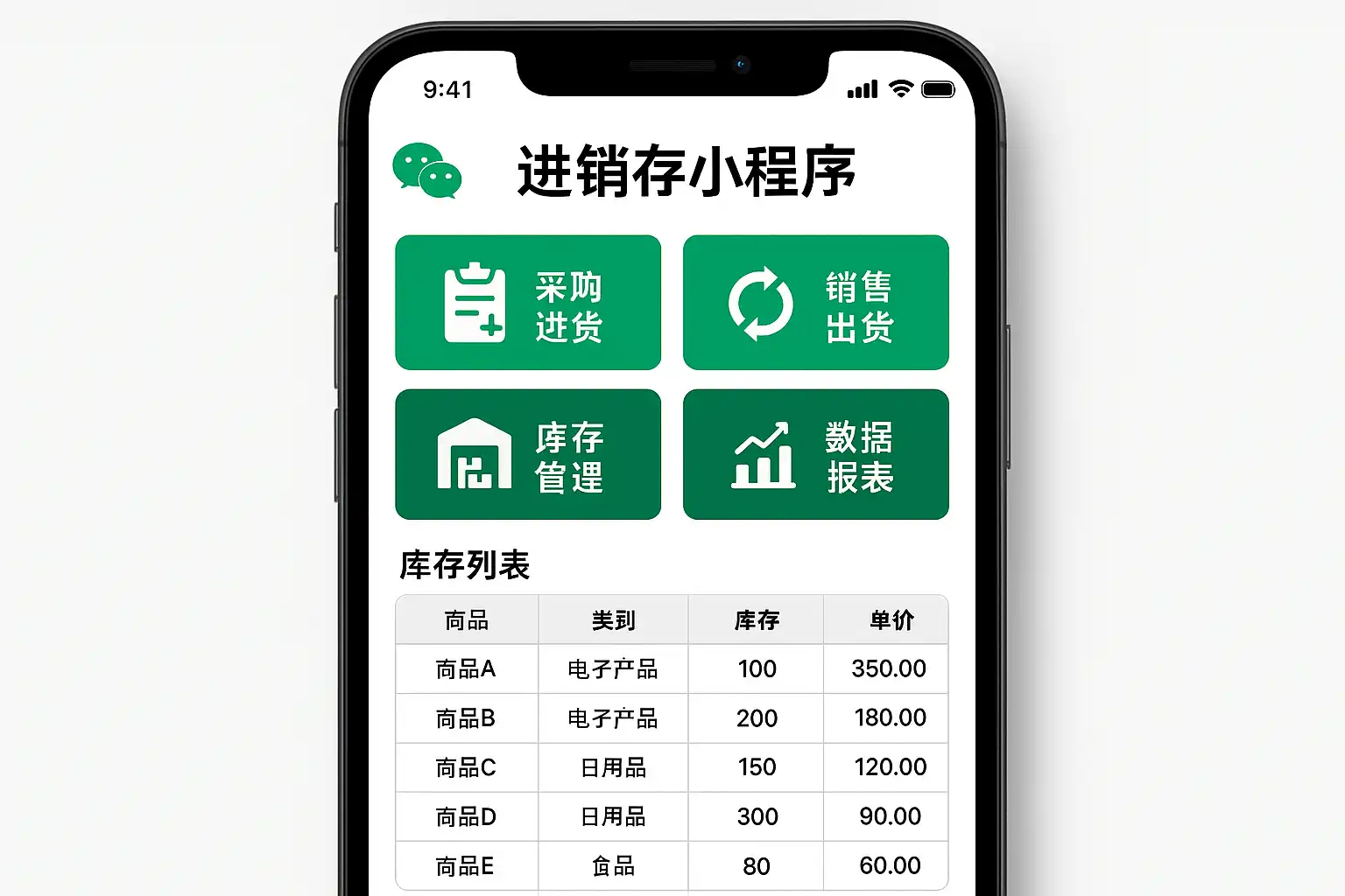 - 微信进销存小程序:基于微信生态,帮助企业或个体商家实现商品采购(进)、销售(销)与库存(存)管理的轻量级应用,可在手机端随时访问。