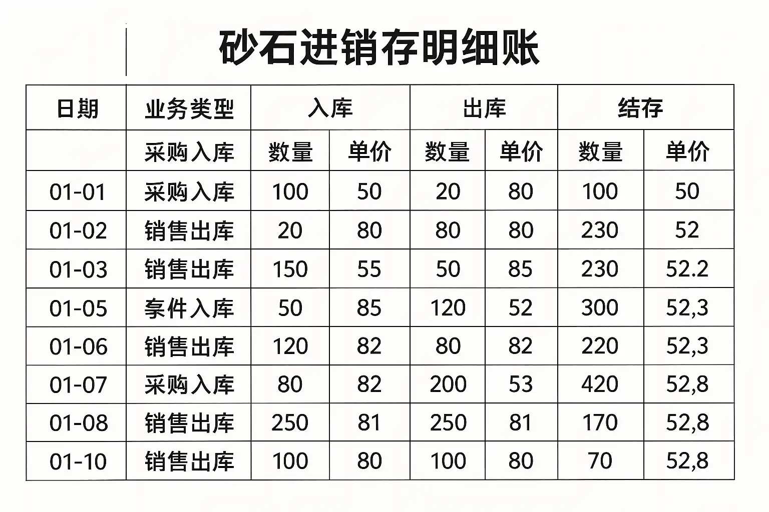 - 3月1日采购30吨河沙,单价42元/吨,入库后总库存80吨。