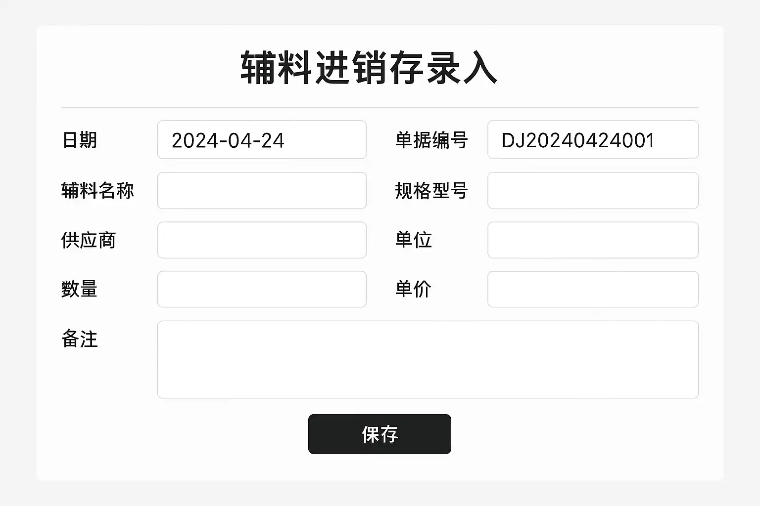 - 建立辅料基础档案:包括名称、规格、单价及供应商信息。