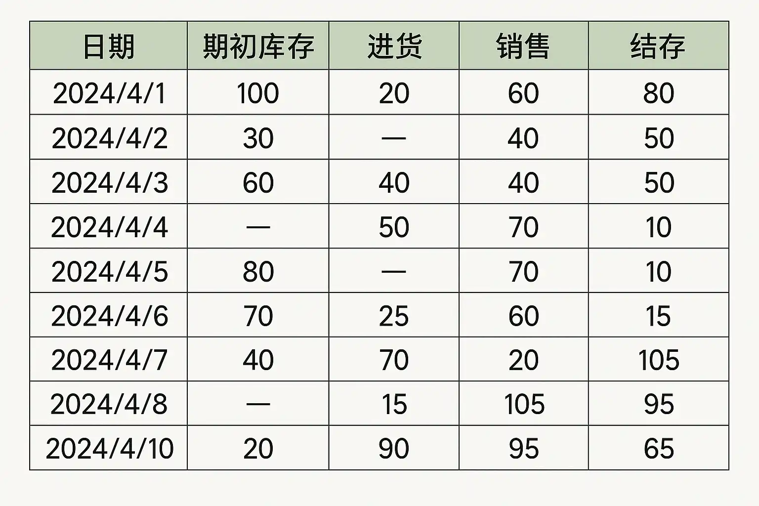| 期初库存 | 某一时间段开始时的商品总量 | 在首行设置初始值,用于后续累计计算 |