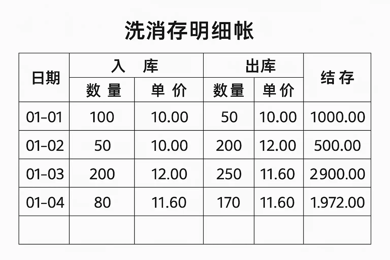 | 日期 | 商品编码 | 商品名称 | 入库数量 | 出库数量 | 库存结余 |