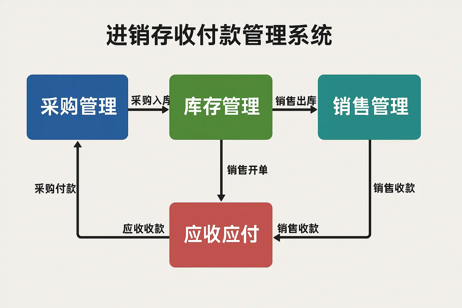 关键模块划分 | 模块名称 | 功能说明 | |:------------|:------------------------------------------| | 采购管理 | 供应商对接、采购订单生成、入库及应付账款处理 | | 销售管理 | 客户下单、出库发货及应收账款跟踪 | | 库存管理 | 库存动态监控、安全库存预警、多仓盘点 | | 财务收付款 | 应收/应付账款登记,收支流水自动生成 | | 报表统计分析 | 实时利润表、销售明细表,应收应付汇总分析 |