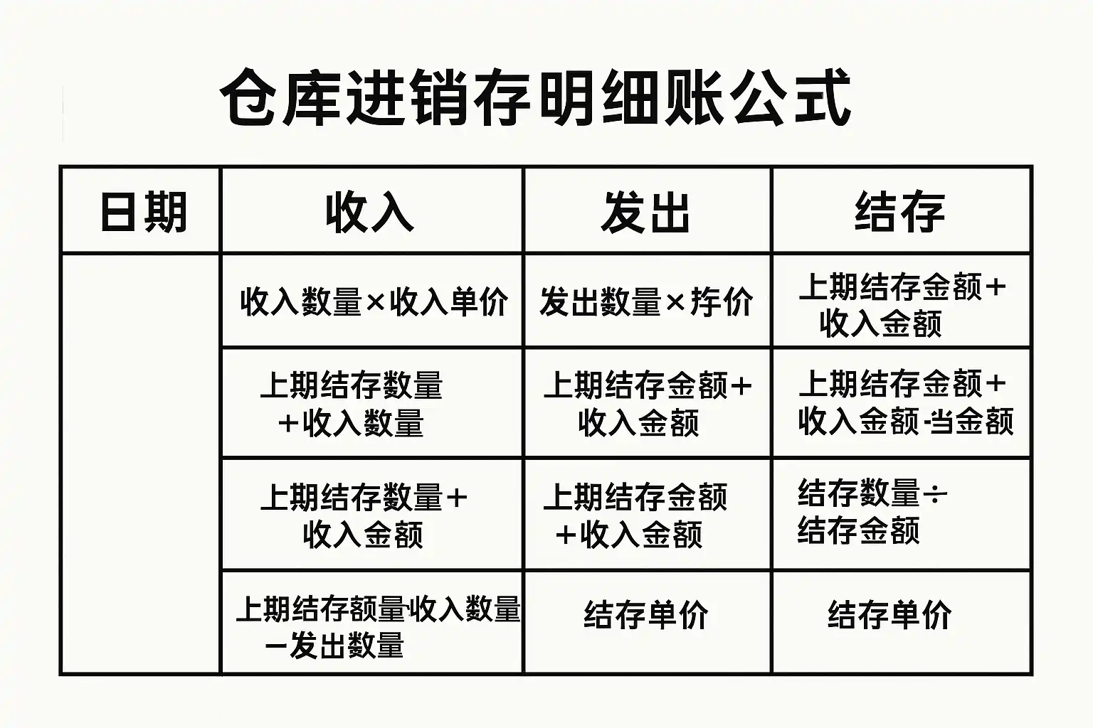 仓库进销存明细账的核心在于通过合理的公式结构,实现对物资流动全过程的动态记录。以下是最基础且通用的计算方法: