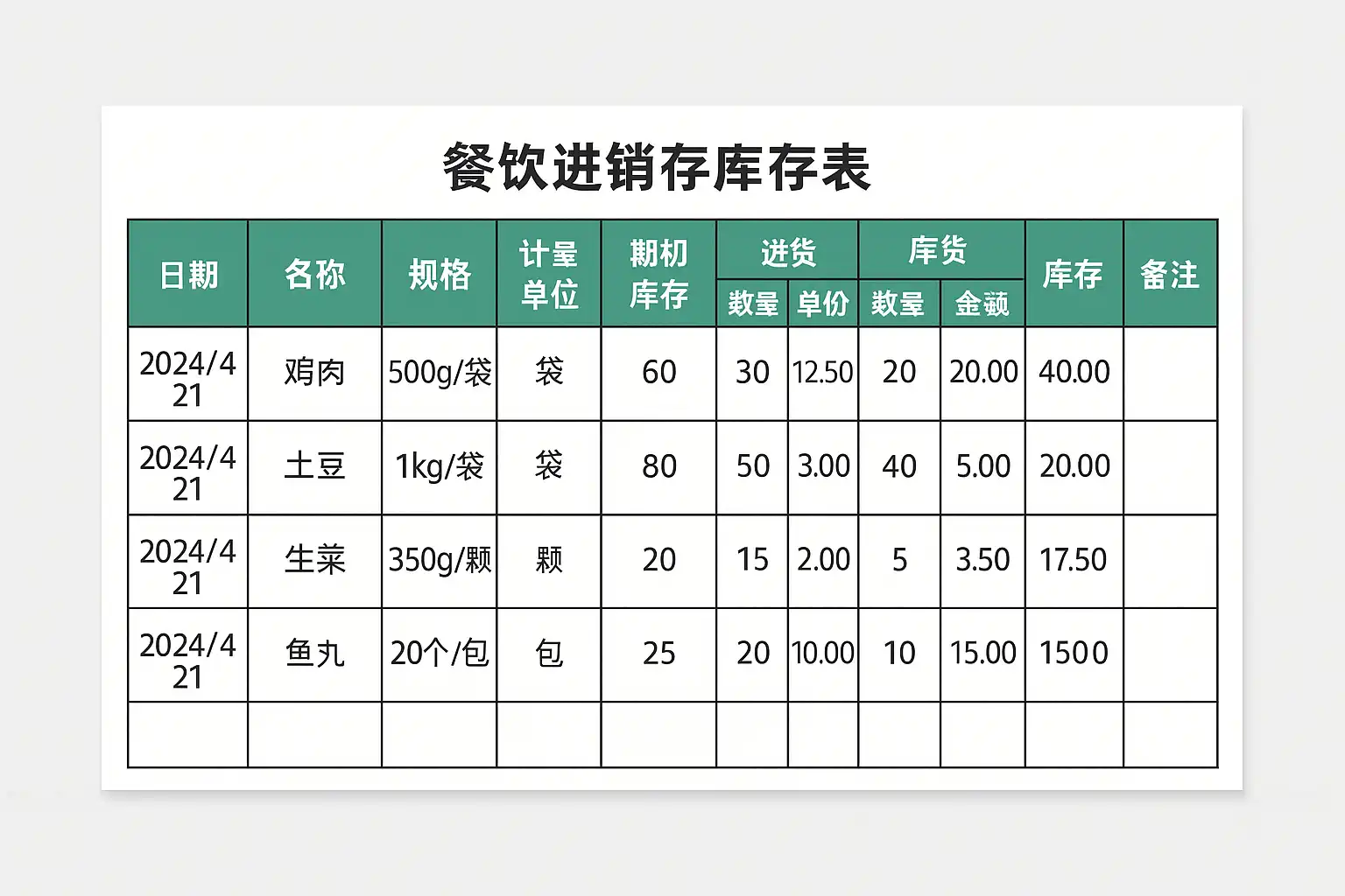 | 日期 | 商品编号 | 商品名称 | 单位(斤) | 期初数量(斤) | 本周采购(斤) | 本周消耗(斤) | 损耗报废(斤) | 期末结余(斤) | | ----------|----------|-----------|-----------|--------------|--------------|-------------|---------------| | 周一 | A001 | 鸡蛋 | 袋 | 20 | 30 | 10 | 0 | | 周二 … … … … … … … … … |