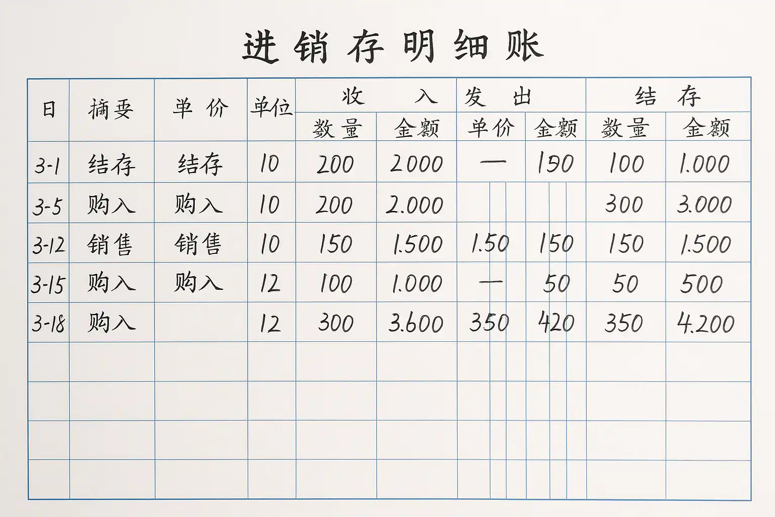 - “收入/发出”分别记录购入和销售数量及金额;