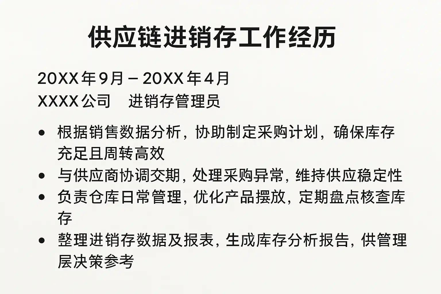 总结来看,要把“供应链进销存工作经历”写好需做到: (1)聚焦核心职责,(2)量化呈现成果,(3)展现信息技术应用实力,(4)可结合STAR法做结构分段,(5)适当加入项目管理和团队协作亮点。