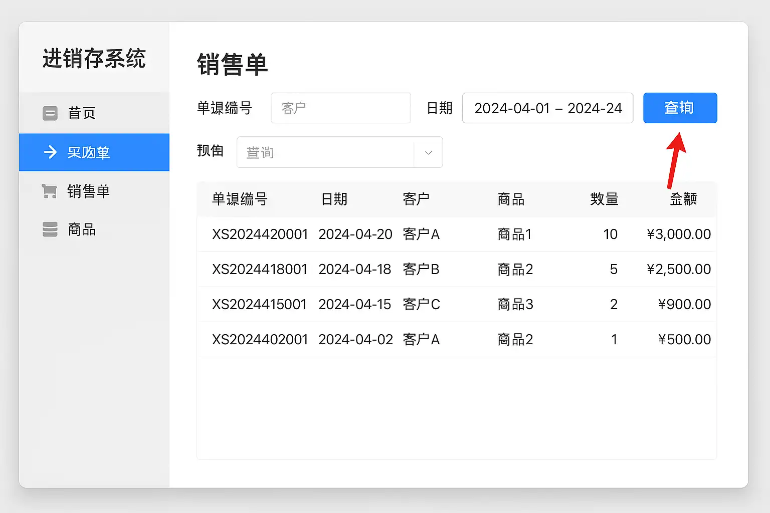- 可按日期区间、客户名称、商品类别等多条件筛选所需的单据列表。