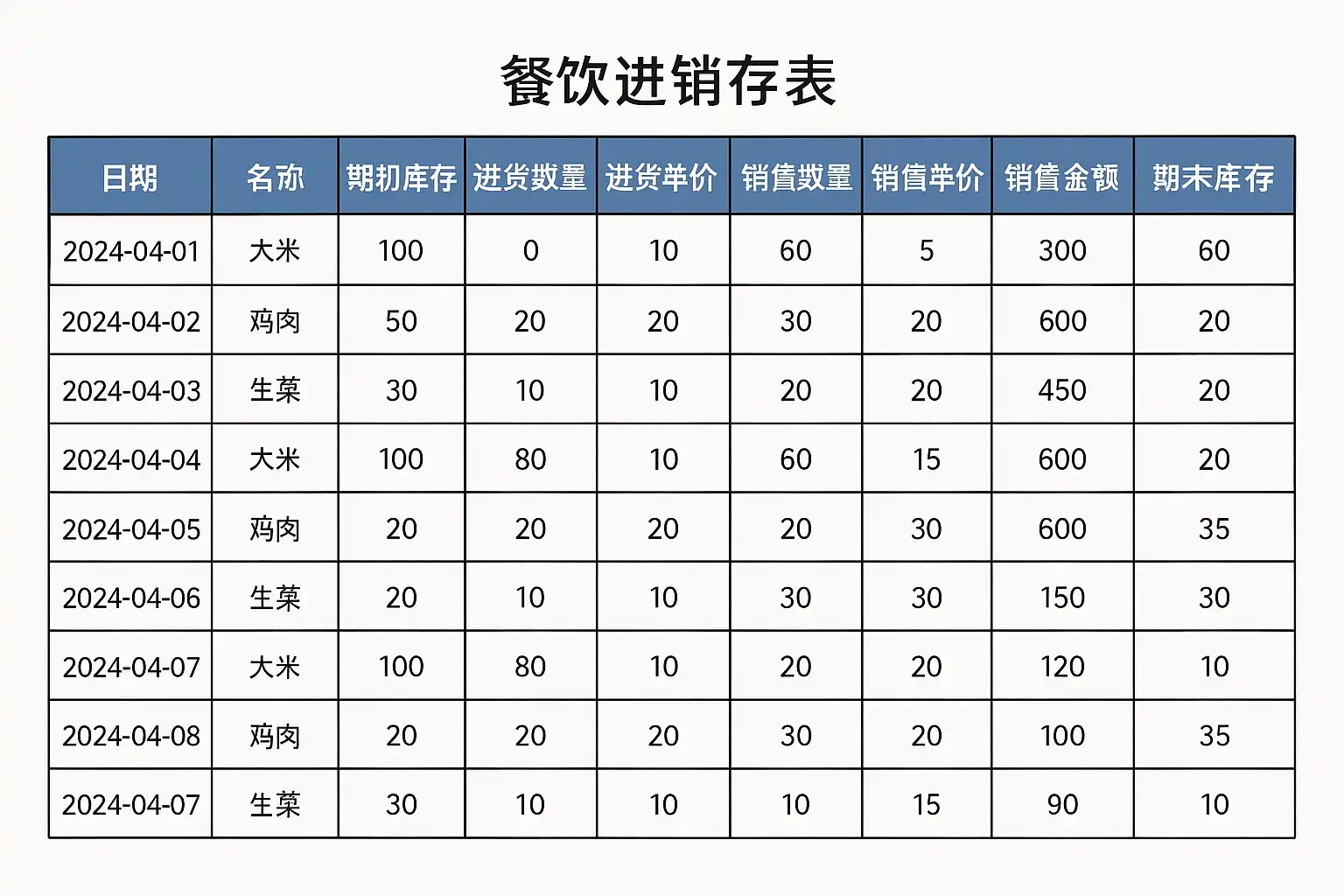 下表展示了一个标准化餐饮进销存表各字段设计:
