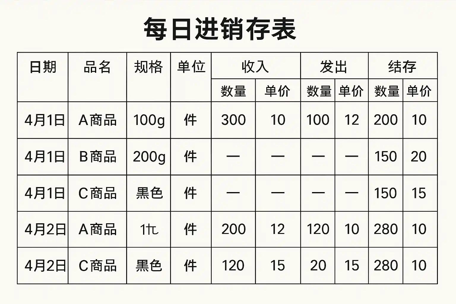 有效的进销存管理离不开科学合理的表格结构。一个标准的每天进销存表至少应包含以下字段: