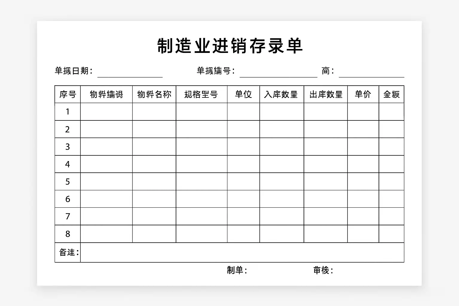 - 采购入库:记录供应商供货信息,包括物料名称、规格、数量和单价。