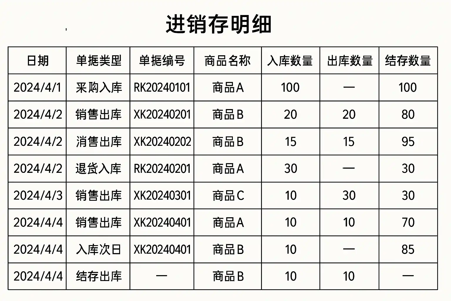 - 所有采购/入库均正数录入“入库数量”,所有销售/出库均正数录入“出库数量”