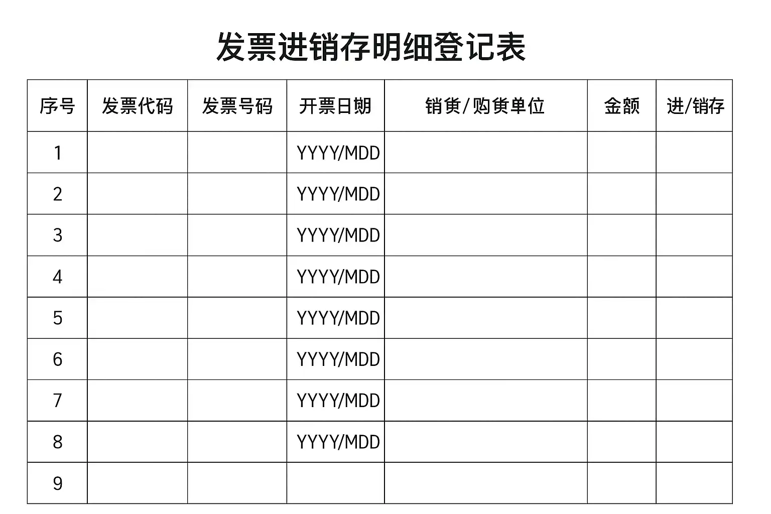 一个科学实用的发票进销存明细登记表,必须涵盖所有必要的数据字段,以完整反映每一笔业务流转。以下是常见的结构设计: