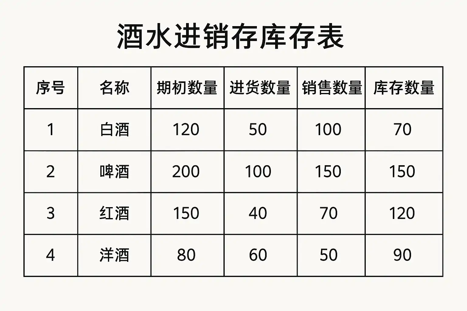 - 明确字段设计:包括酒水名称、规格、单位(瓶)、入库数量、出库数量、当前库存。
