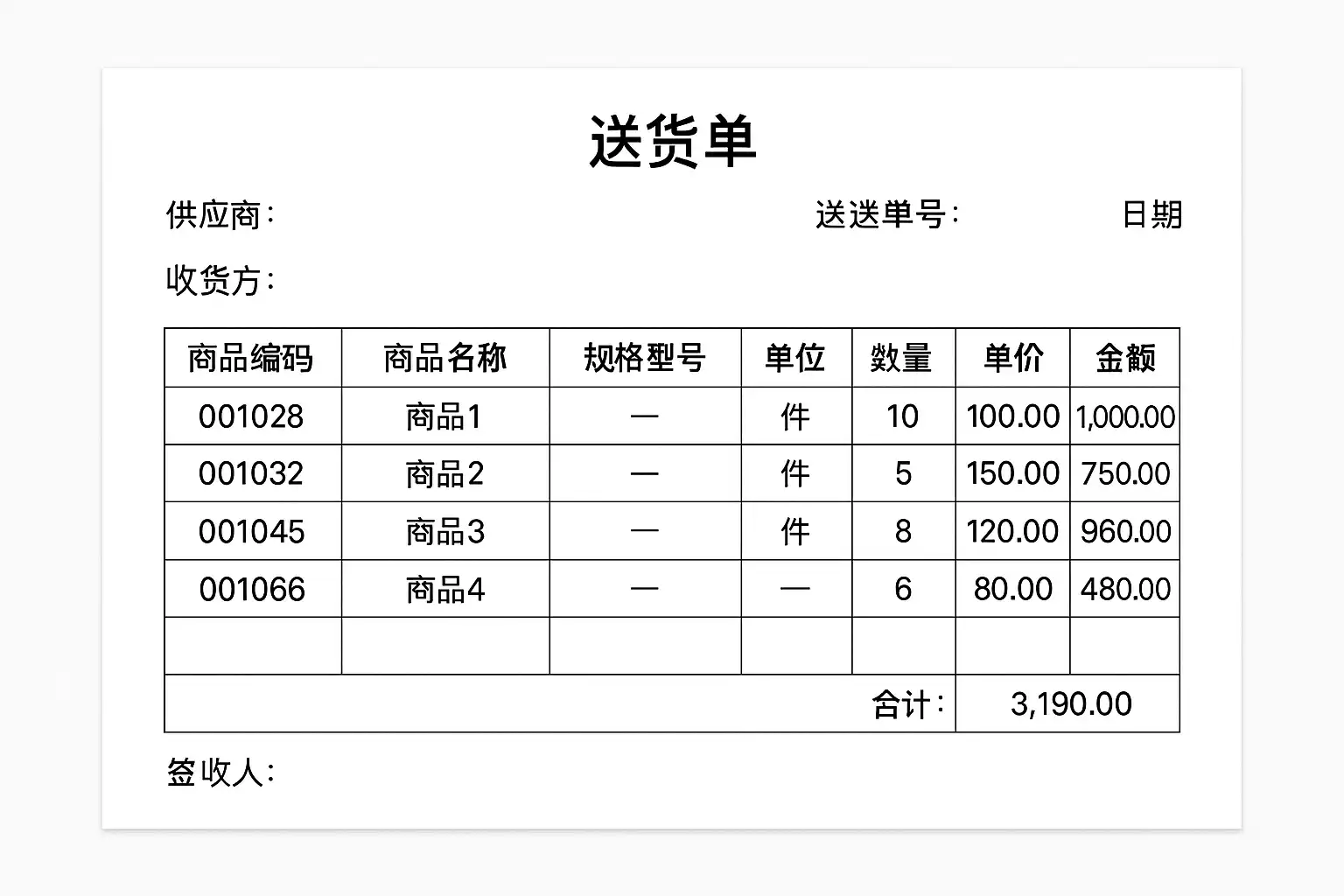 - 核心要素梳理 一份标准的送货单通常包含以下几部分: