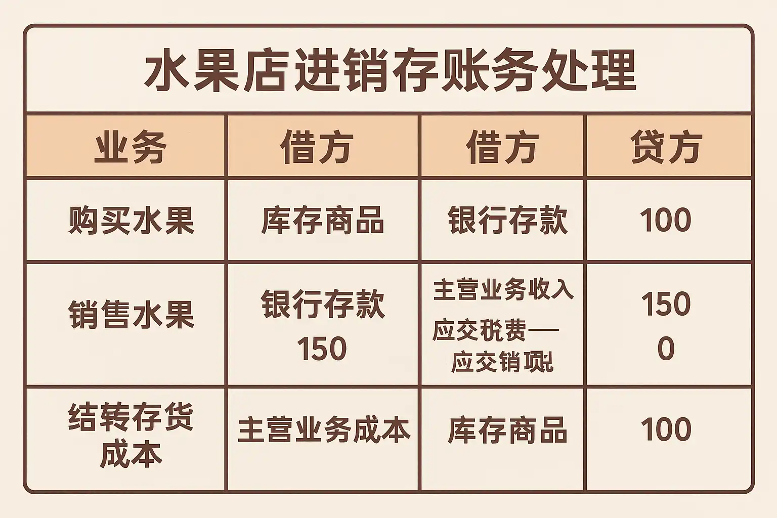 | 成本 | 批发苹果5箱 | 入库单价计入“主营业务成本” |