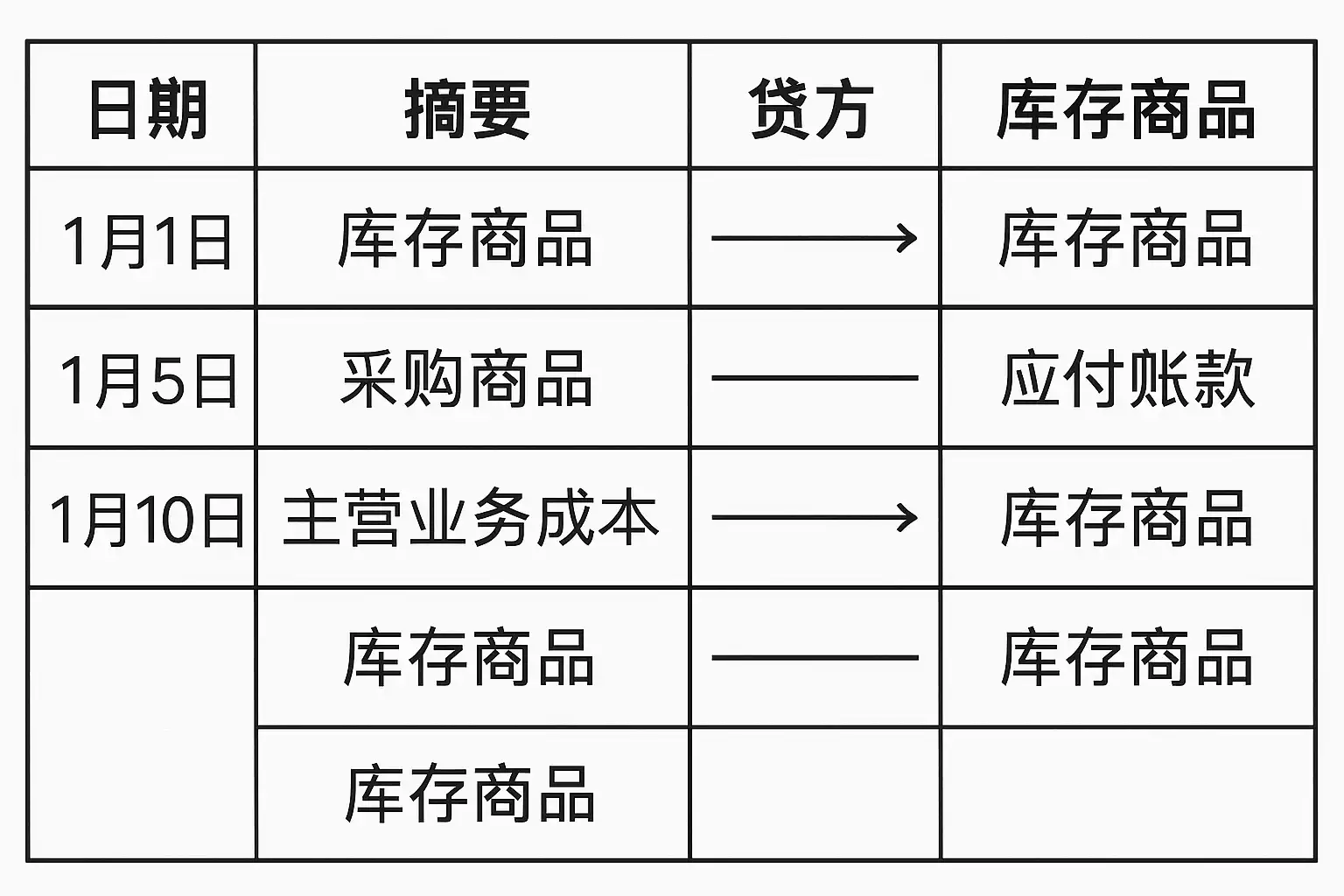 | 入库 | 验收入库 | 库存商品 | X | 应付账款 | X |