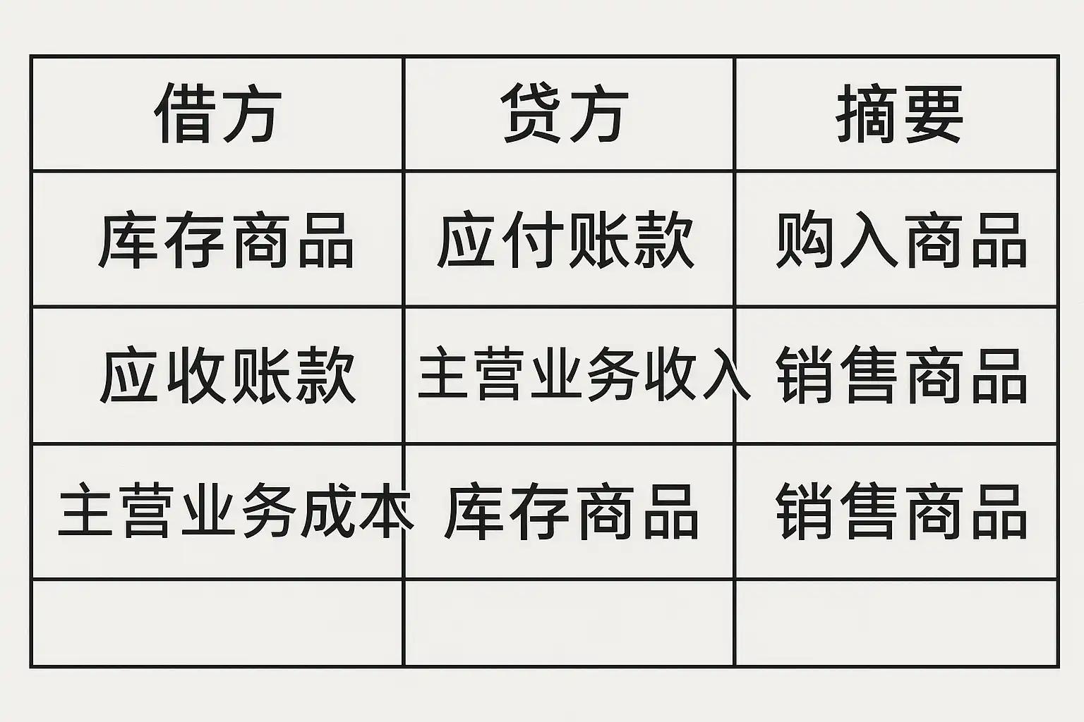 | 实际多于账面 | 增加‘库存商品’余额 | 借:库存商品;贷:营业外收入 |
