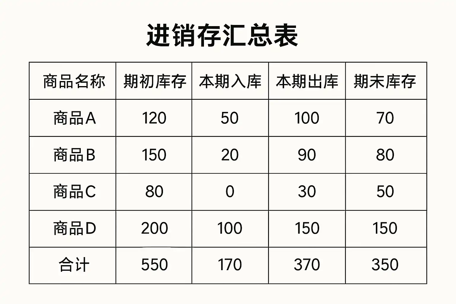 进销存汇总表是企业对采购(进)、销售(销)、库存(存)三大环节进行综合管理的重要报表。其基本结构主要包括以下几项: