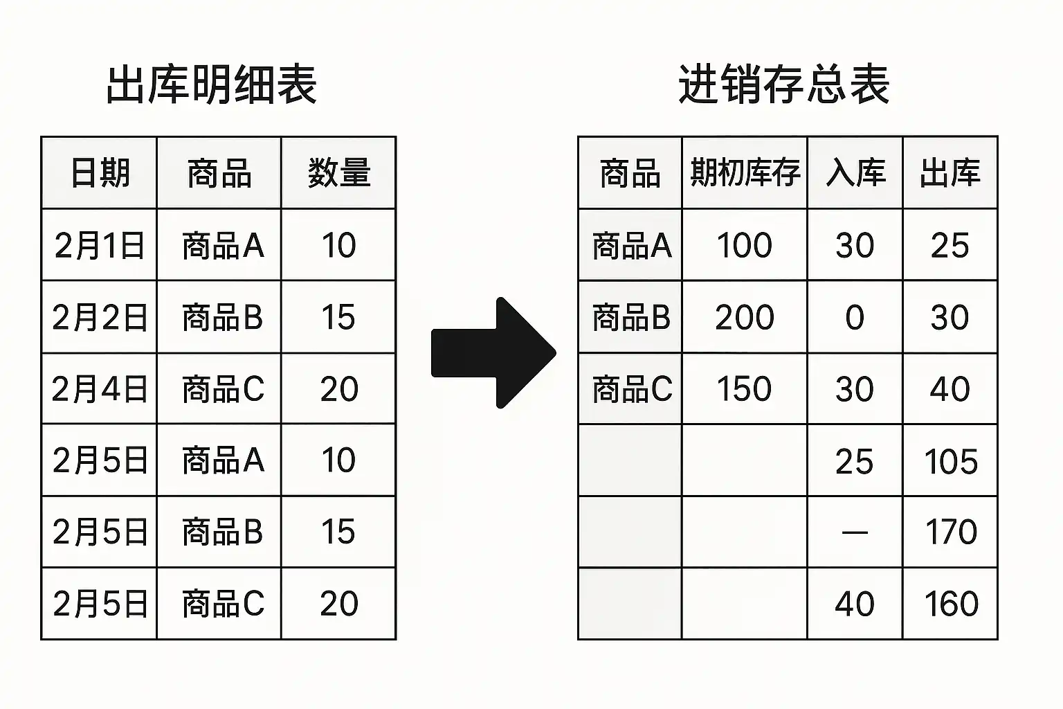 我在做库存管理时,发现出库明细表数据量很大,想知道如何高效地将出库明细表汇总到进销存总表中,以便更好地掌握库存变化和销售情况。