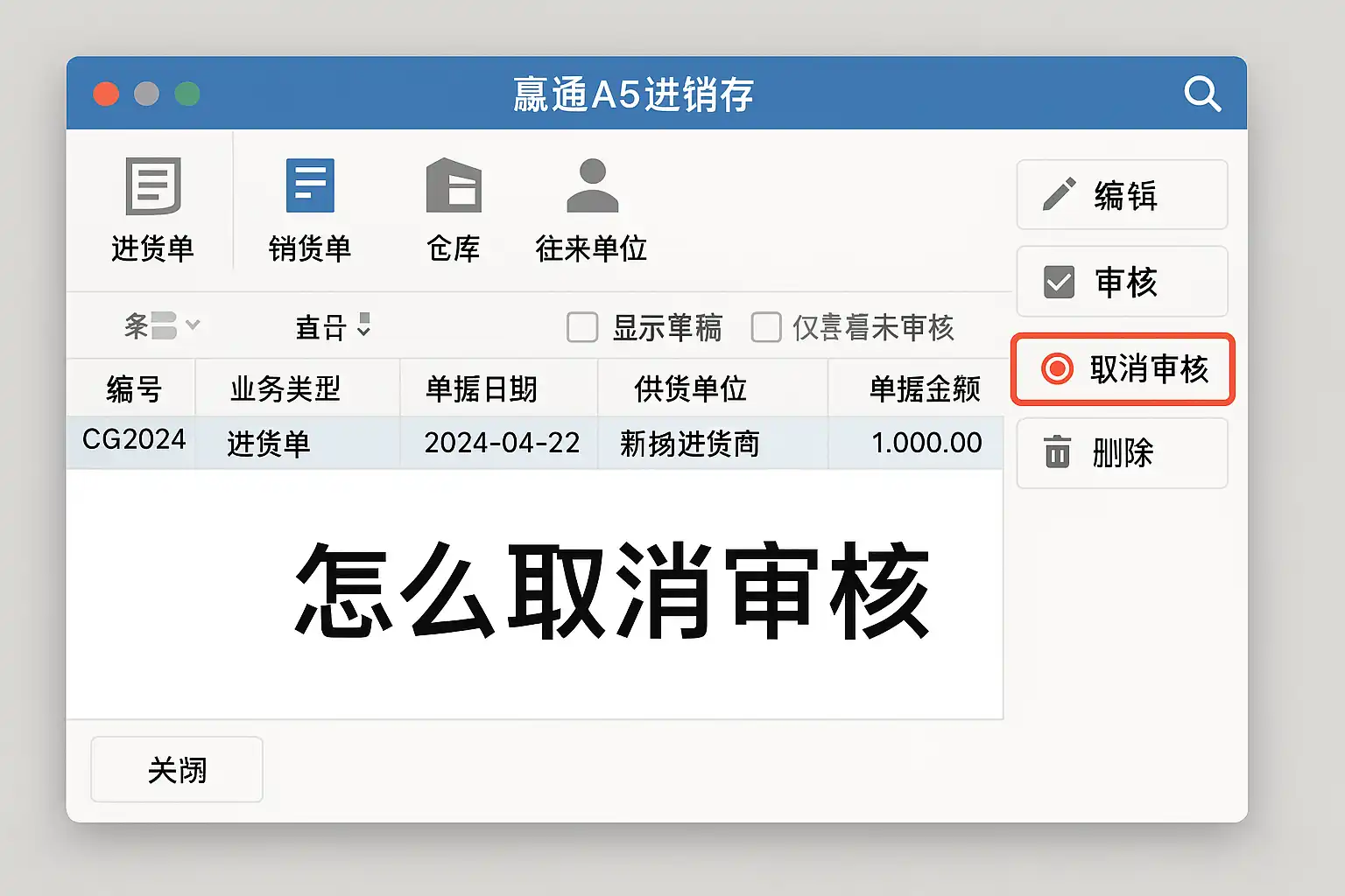 在赢通A5进销存系统里,取消审核操作可以通过以下步骤完成: