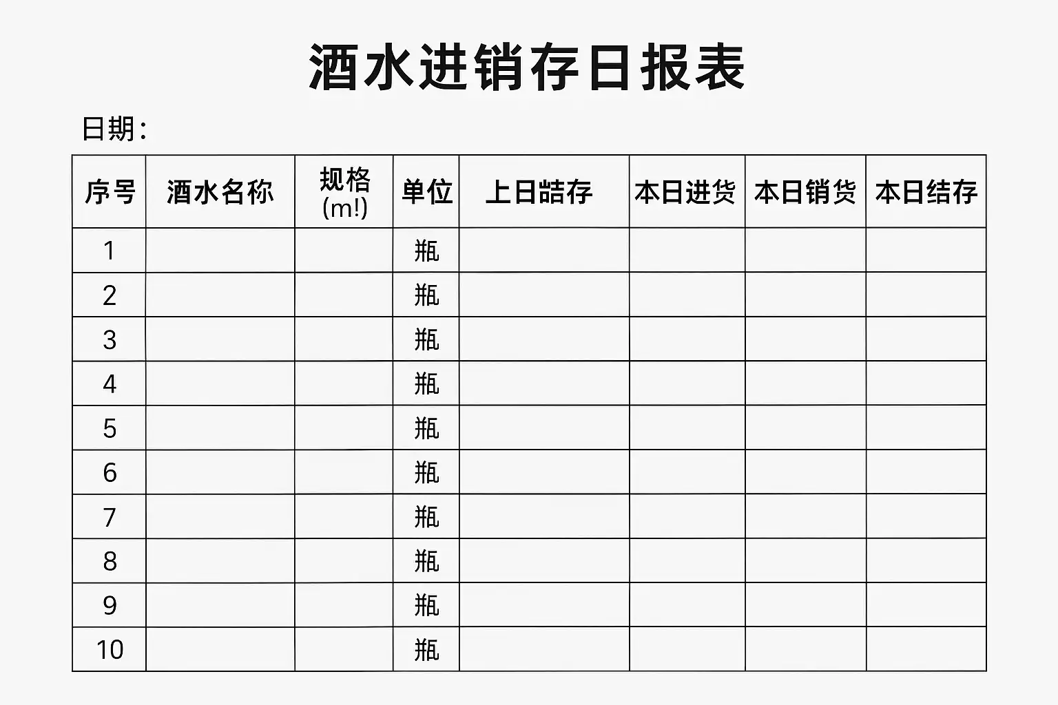 | 日期 | 品名 | 规格 | 单位 | 期初库存(瓶) | 本日入库(瓶) | 本日出库(瓶) | 期末库存(瓶) |