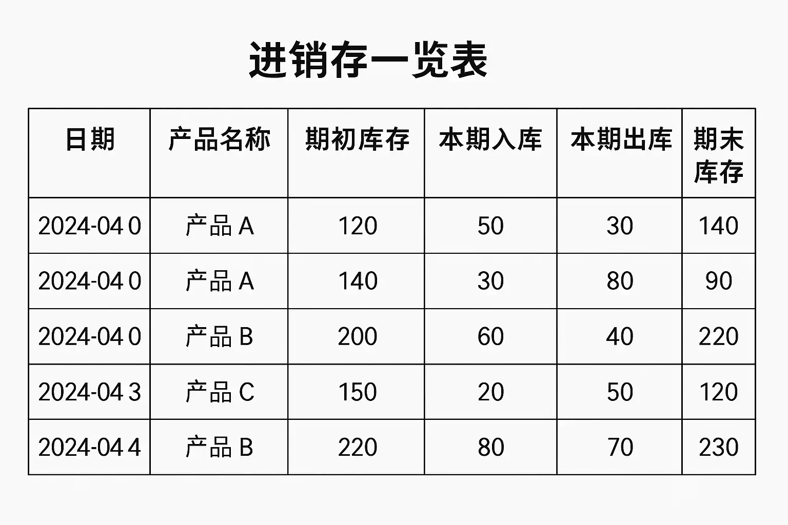 一个科学的进销存一览表需要覆盖以下关键信息字段。这样可保证商品全流程状态清晰透明: