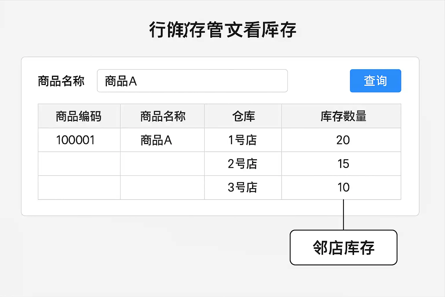 | 查询操作 | 用户在商品详情页面或专属“跨门店查询”模块输入条件即可查阅相关数据。 |