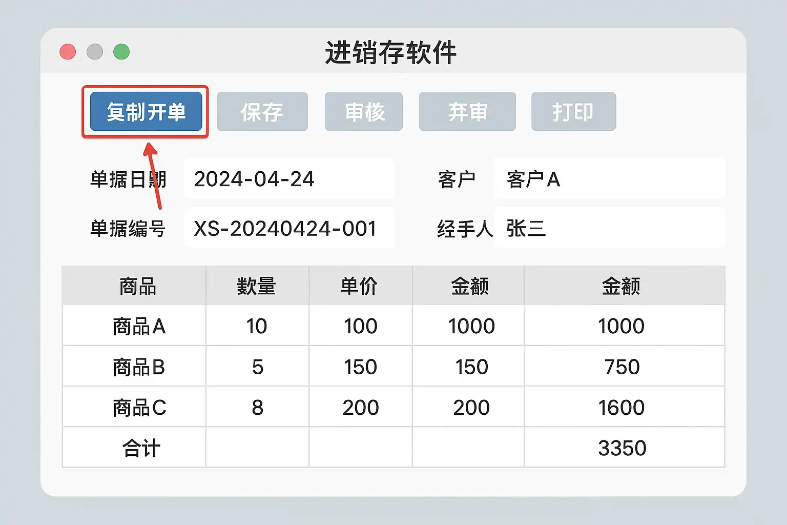 “复制开单”是进销存系统中常见的辅助操作功能,主要用于基于已有订单或采购、销售、库存等业务单据模板,快速生成新的业务单据。其本质是将原有订单数据结构和内容完整或部分复用到新的业务流程中,为用户省去了重复录入商品信息、价格、数量、客户资料等繁琐步骤。