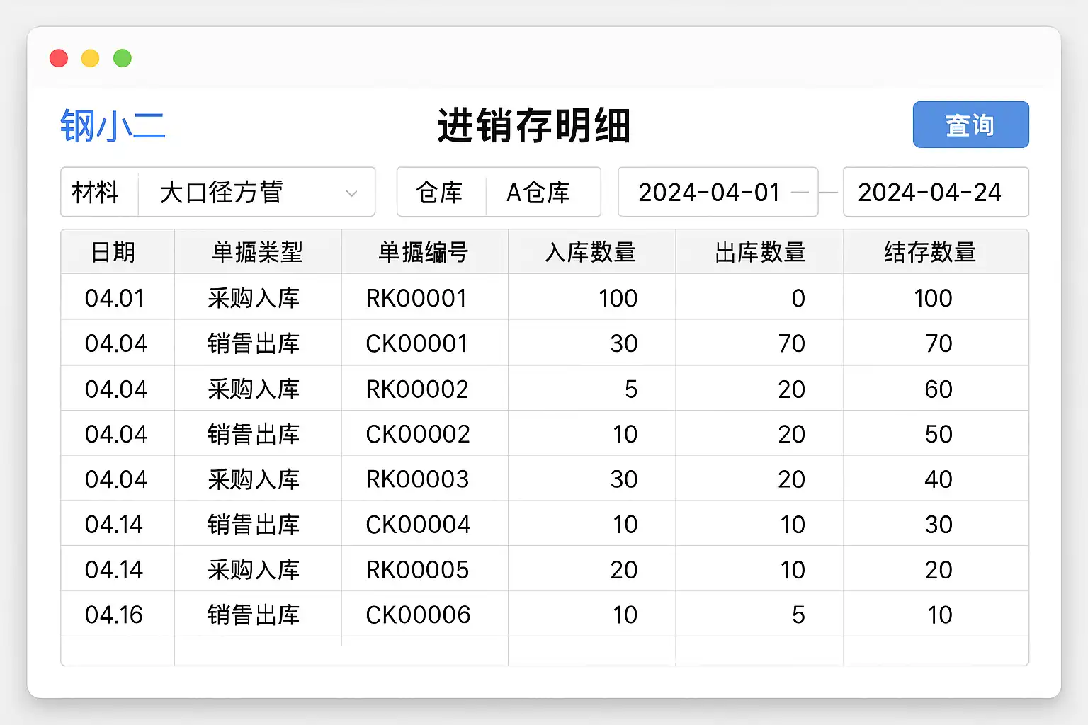 钢小二软件进销存明细报表主要包含以下核心栏目: