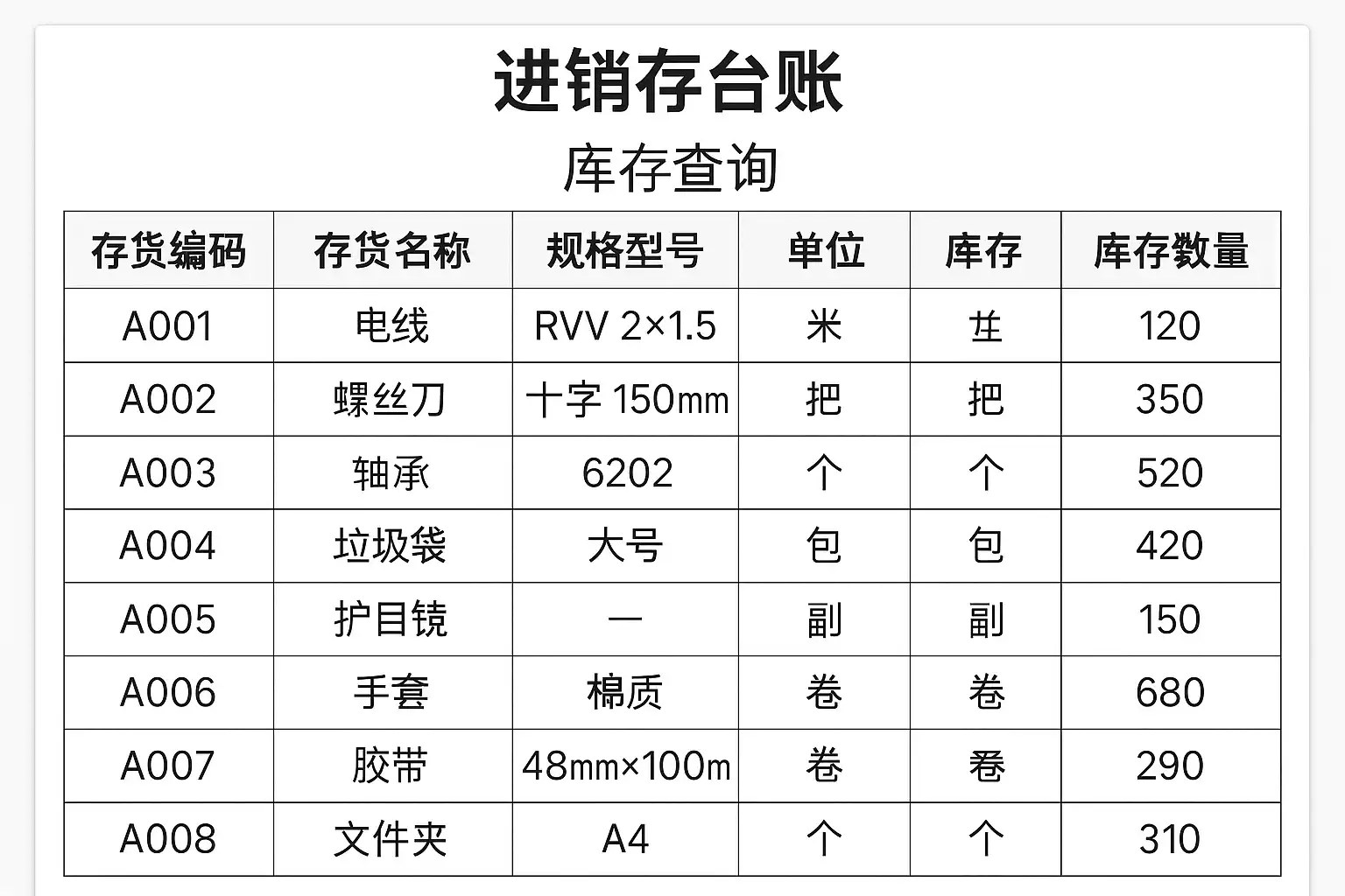 | 查询与报表导出 | 多条件筛选当前或历史库存 | 可自定义筛选字段 |