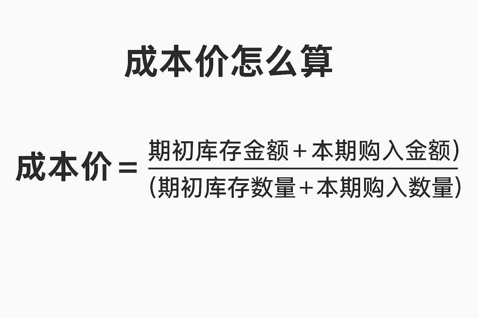 成本价 = (期初库存总价值 + 本期购入总价值) / (期初库存数量 + 本期购入数量)。