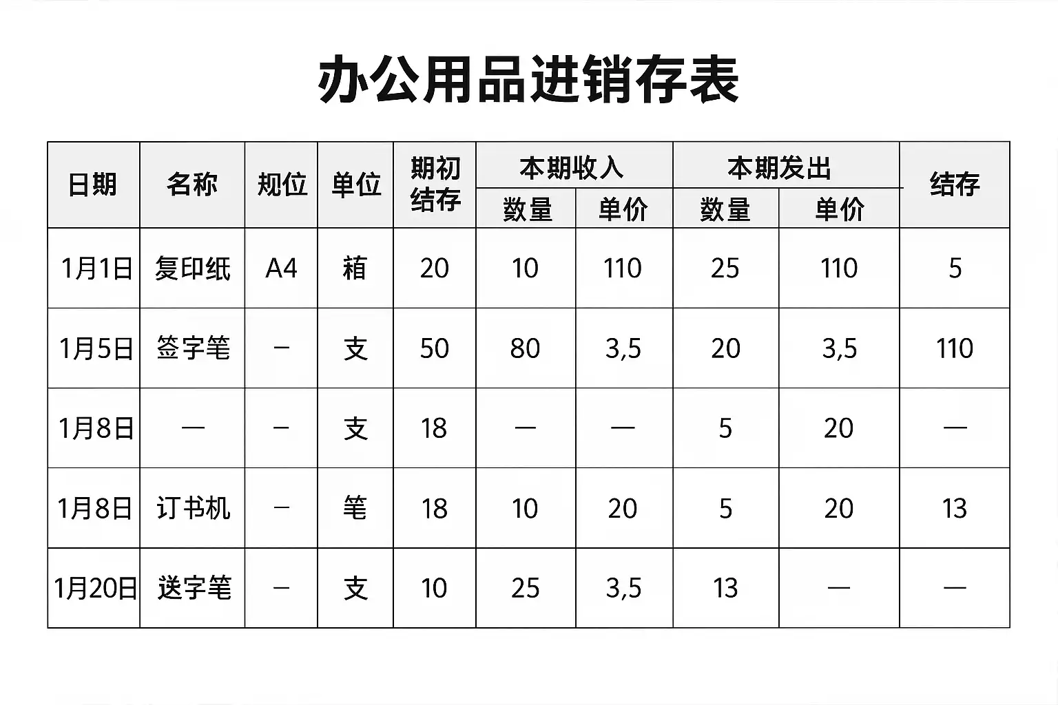 - 进销存表的定义与作用 办公用品进销存表是指对公司内所有办公消耗品(如纸张、笔墨、打印耗材等)的采购(进)、领用(出)、库存(存)进行系统化记录与跟踪的数据载体。其主要作用包括: