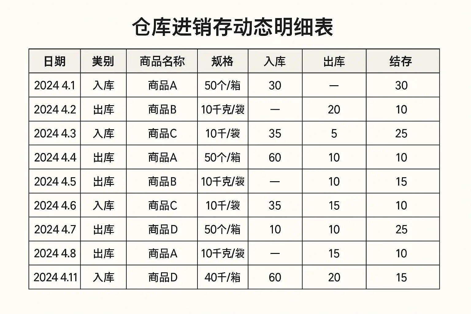 一个科学的仓库进销存动态明细表应覆盖以下核心要素: