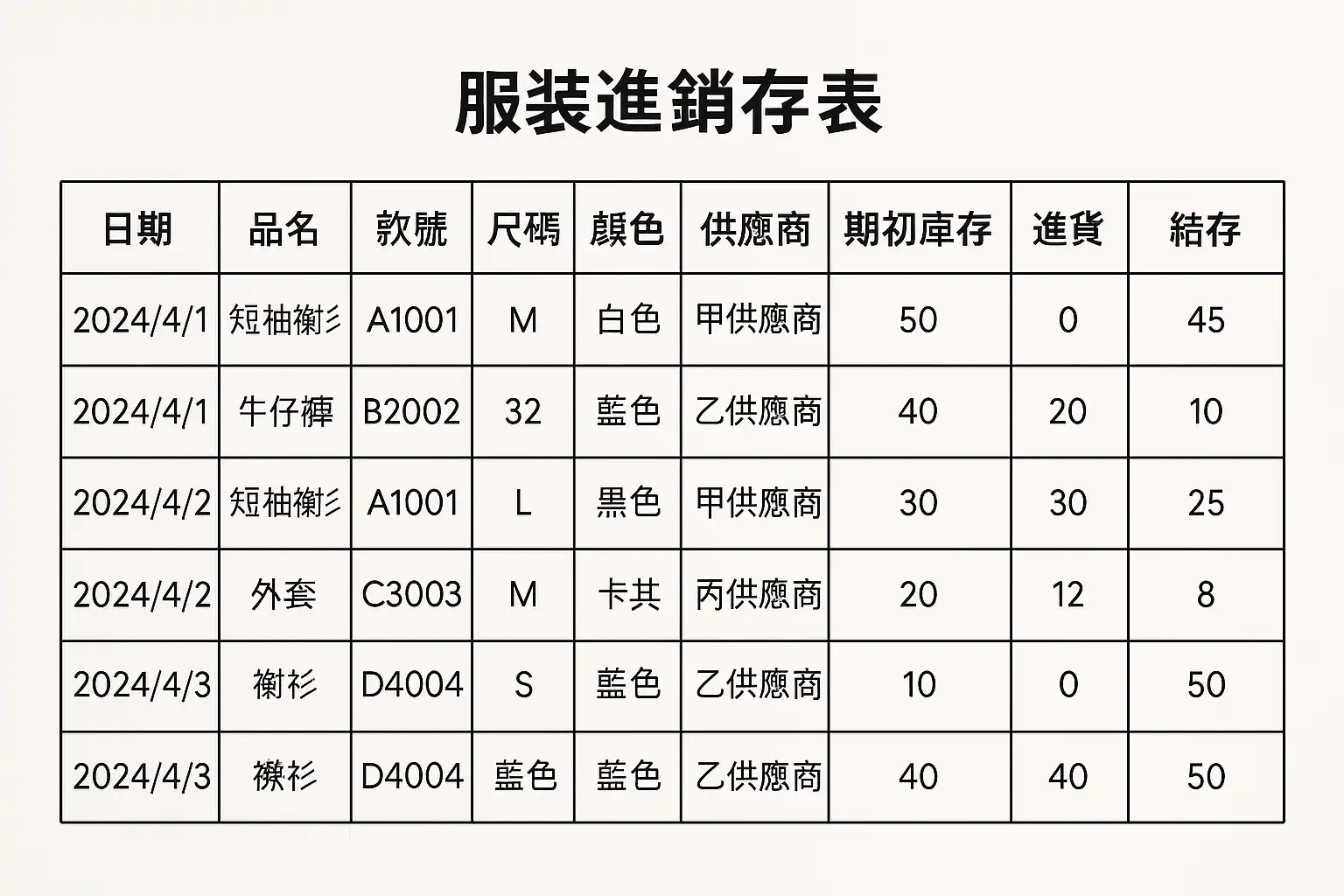案例:某服装店通过此表每天更新采购与销售数据,实现库存实时动态管理,提升了30%的补货效率。